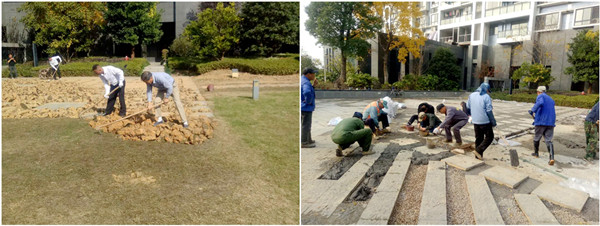 方案中針對現(xiàn)有問題進(jìn)行了逐一解決,重新規(guī)劃了該區(qū)域,綠化師傅們對一部分草坪植被區(qū)進(jìn)行翻土鋪裝鵝卵石、花崗巖,對另一部分草坪植被區(qū)進(jìn)行泥土加層、翻新。